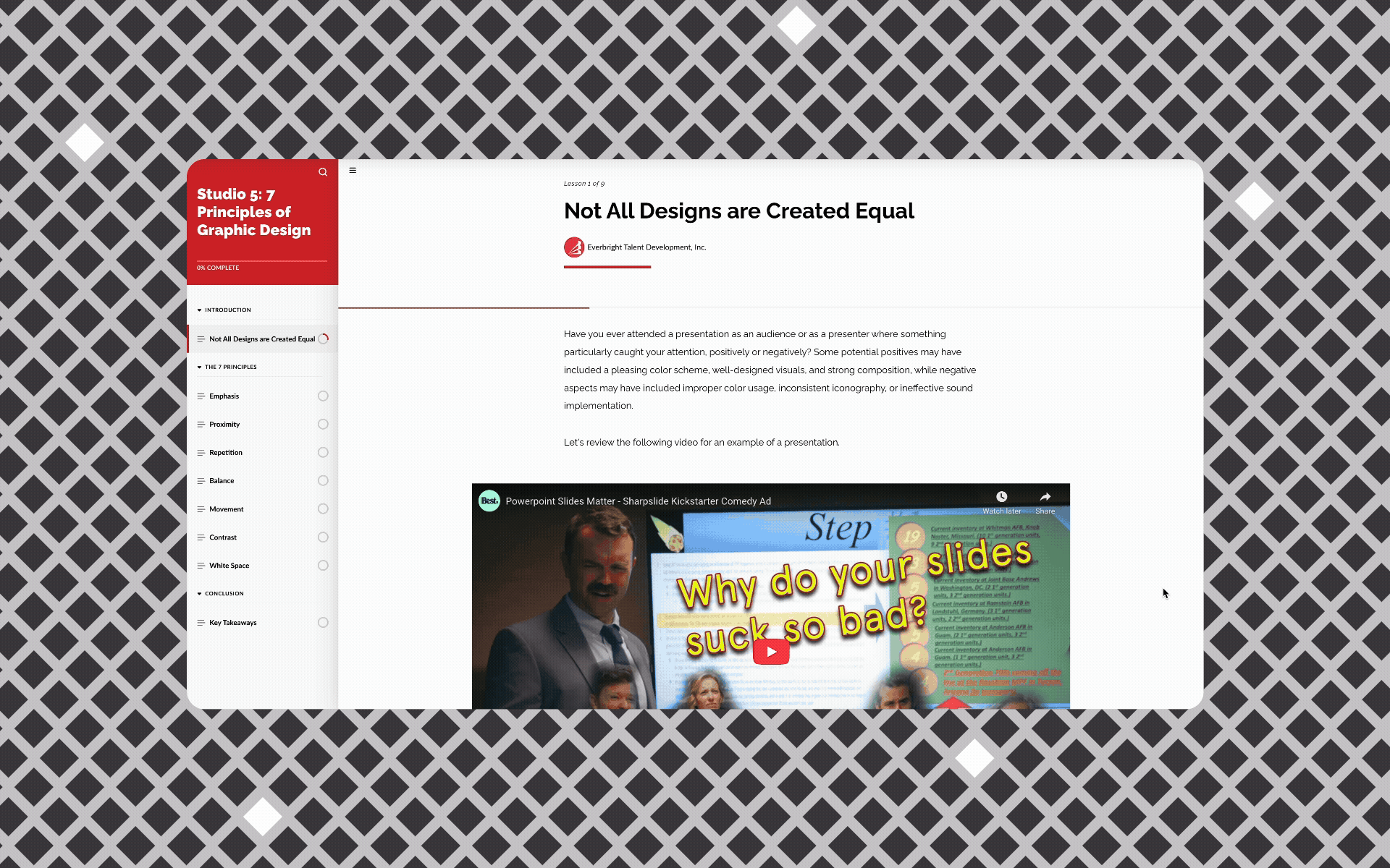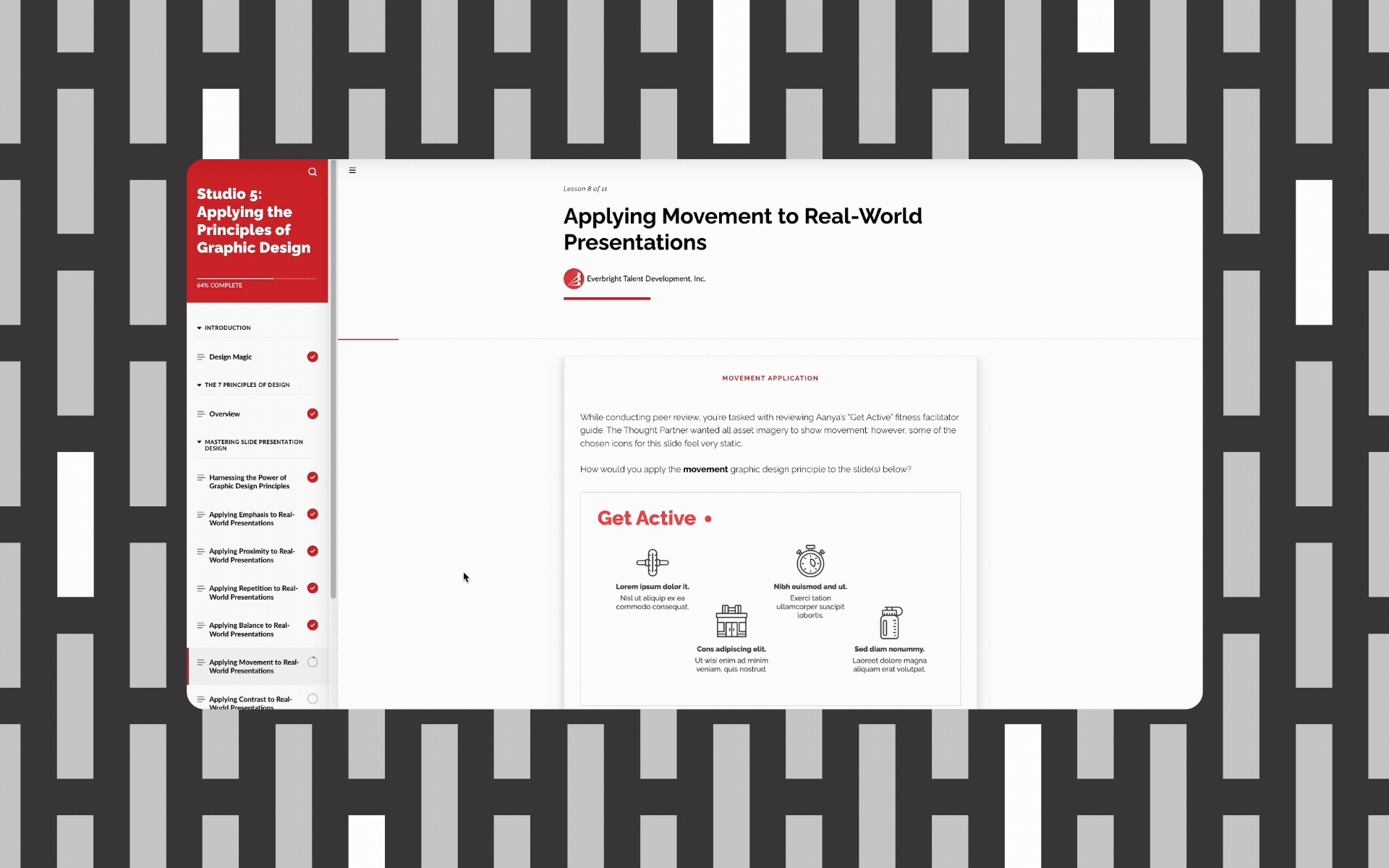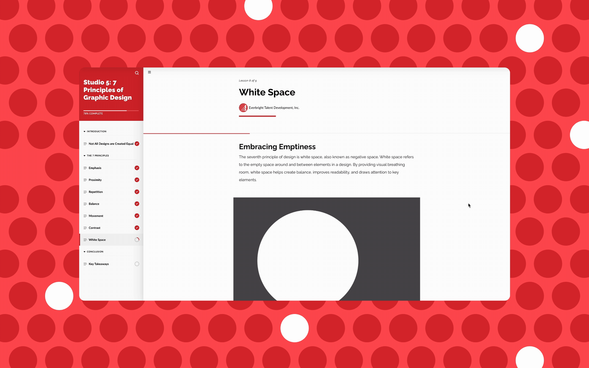 7 Principles of Graphic Design is a digital learning course created by a three-person visual design team to teach learning experience designers the fundamentals of visual design. Built from the ground up for Studio 5 (now Everbright), the course empowered non-designers to take greater ownership of visual decisions at a time when the design team was stretched across many simultaneous projects.
